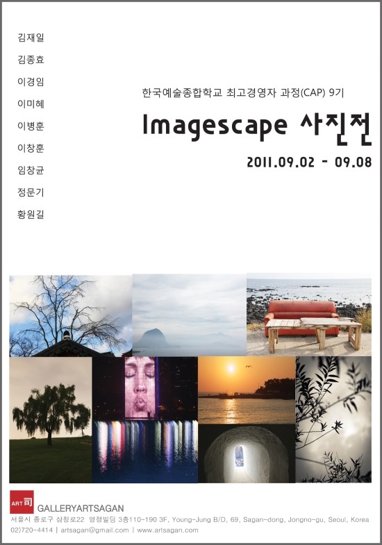 한국예술종합학교 최고경영자 과정( CAP )9 기, 그러니까 2010년 사진 수업에 참여했던 사람들이 모여 결성한 사진연구 모임 "Imagescape" 가 전시를 준비했다. 비록 수업 기간이 짧았고, 그래서 사진에 대한 이해와 준비가 부족한 것도 사실이지만 큰 용기를 냈다. 보통 아마추어들이 흔히 빠지게 되는 환상, 그러니까 프로들의 그 것을 흉내 내거나 기성의 이미지를 따라 가는 것처럼 진부한 일도 없다는 것만 잊지 않는다면 일단 그 것만으로도 가능성은 기대해 볼 수 있다는 것을 우선 말씀 드리고 싶다. 최소한 달라지기 위해 용감할 수 있다면 더욱 좋다. 다름은 도전이고 굳건히 우겨 댈 수 있는 가능성을 말하기 때문이다. "Imagescape"가 나아갈 길은, 해야할 사진의 길은 여기에 있다.