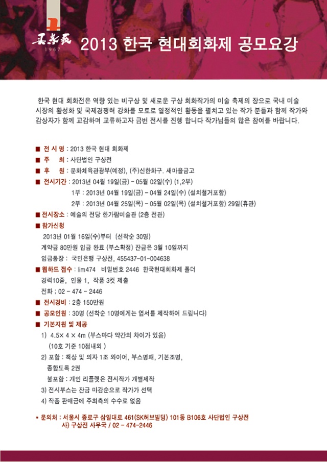한국 현대 회화전은 역량 있는 비구상 및 새로운 구상 회화작가의 미술 축제의 장으로 국내 미술시장의 활성화 및 국제경쟁력 강화를 모토로 열정적인 활동을 펼치고 있는 작가 분들과 함께 작가와 감상자가 함께 교감하며 교류하고자 금번 전시를 진행 합니다 작가님들의 많은 참여를 바랍니다.