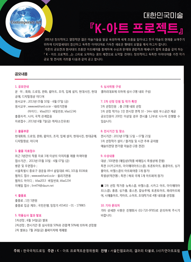 기존의 공모전과 현시대의 흐름인 아트페어를 함께하여 수상과 판매와 관람객과 메세나가 함께 호흡을 같이 하는『 K - 아트 프로젝트 』는 스타로 도약하는 꿈의 제전으로 도약할 것이다. 창의적이고 독특한 아이디어를 가진 작가 공모 및 전시회 개최를 다음과 같이 공고 합니다.