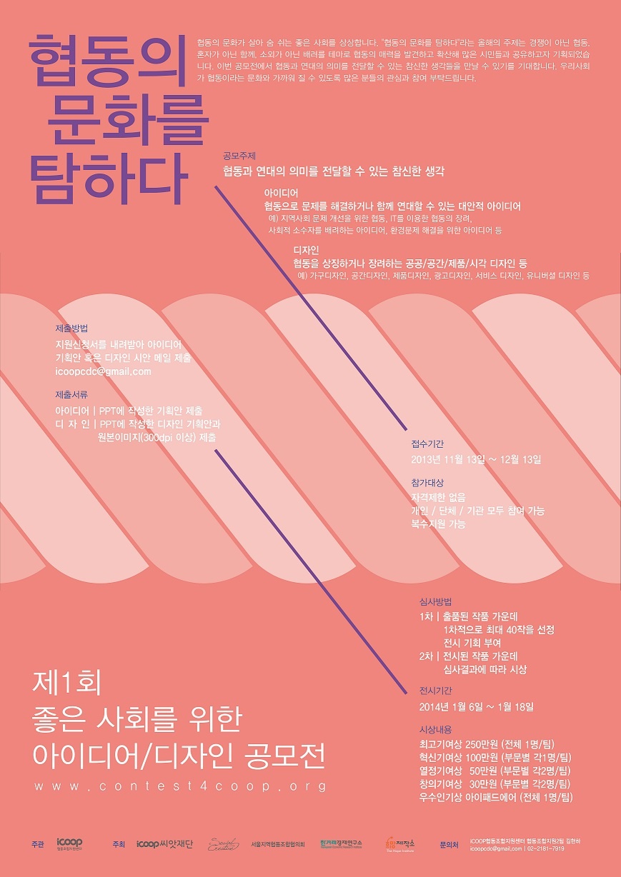 홈페이지에서 지원신청서를 내려받아 아이디어 기획안 혹은 디자인 시안 메일(icoopcdc@gmail.com) 제출