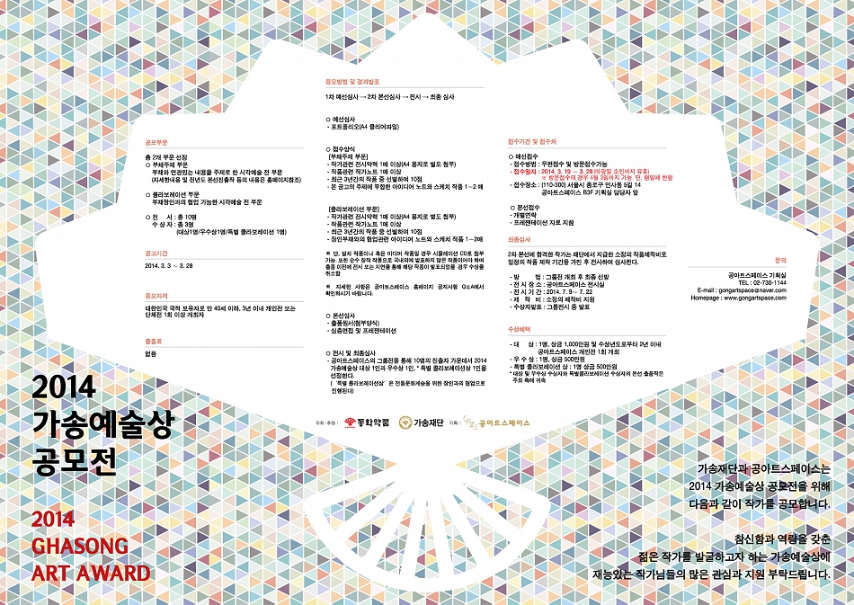 - 공아트스페이스의 그룹전을 통해 10명의 진출자 가운데서 2014 가송예술상 대상 1인과 우수상 1인,*특별 콜라보레이션상 1인을 선정한다.