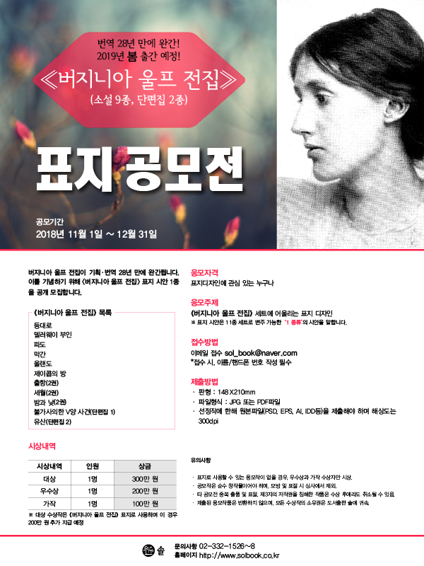 이를 기념하기 위해 <버지니아 울프 전집표지 시안 1종을 공개 모집합니다