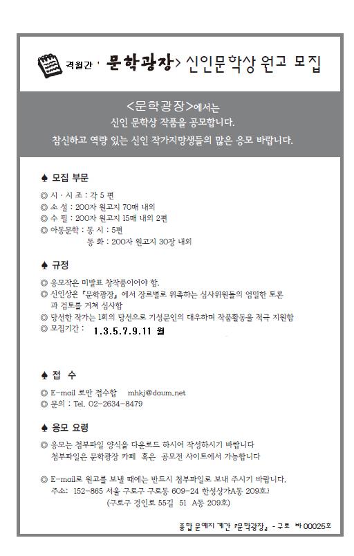 격월간 『문학광장』은 역량있는 작가를 발굴하기 위해 아래와 같이 제75기 신인작가를 공모합니다. 패기있고 개성있는 신인들의 많은 관심과 응모를 바랍니다.