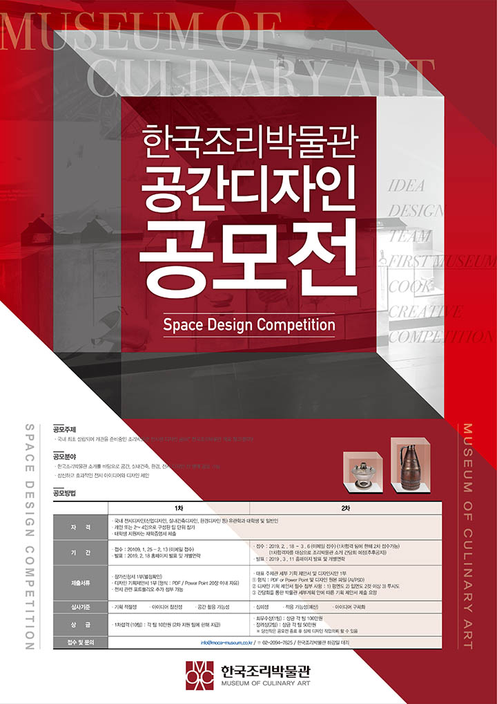 - 한국조리박물관 소개를 바탕으로 공간, 실내건축, 환경, 전시 디자인 전 영역 공모 가능