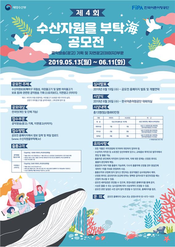 해양수산부와 한국어촌어항공단은 대국민 수산자원관리 정책 참여로 수산자원보호에 대한 관심유발 및 인식증진을 위해 <수산자원을 부탁海 공모전>을 개최합니다. 폐어구 위험성 인식 및 수산자원관리와 관련된 국민의 다양한 생각을 공익방송 기획(스토리보드)와 지면광고(이미지)에 담아주세요. 이번공모전을 통해 수산자원보호에 대해 생각할 수 있는 기회가 되길 바랍니다.