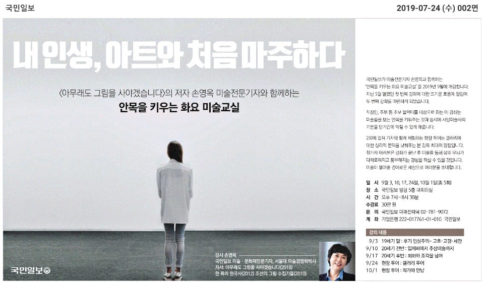 《국민일보》가 미술전문기자 손영옥과 함께하는 ‘안목을 키우는 화요 미술교실’을 2019년 9월에 개강합니다. 지난 5월 열렸던 첫 번째 강좌에 대한 뜨거운 호응에 힘입어 두 번째 강좌를 마련하게 되었습니다.