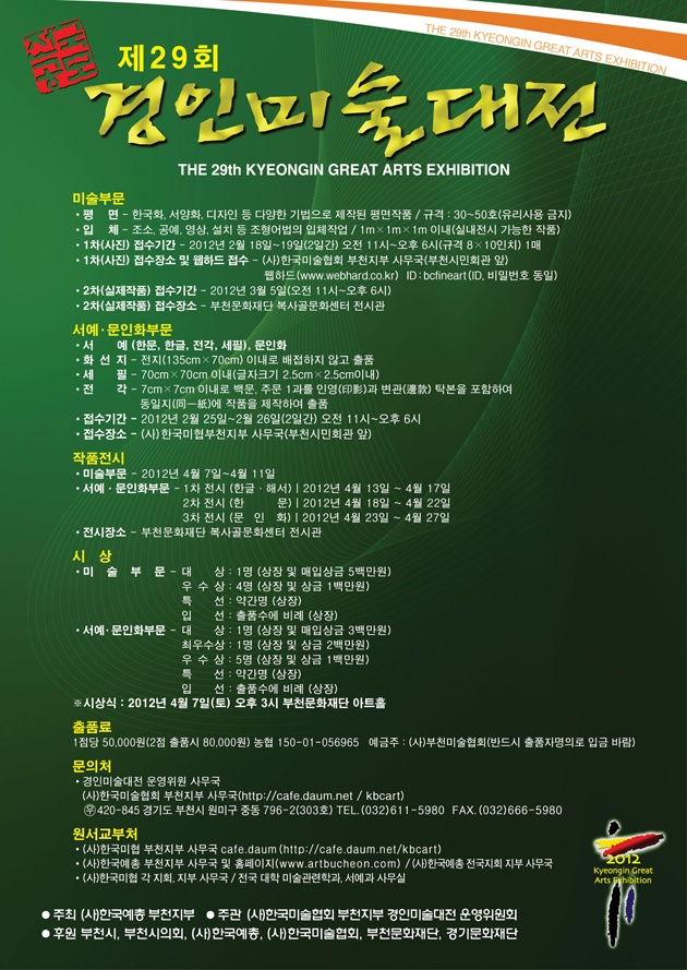 한국미술의 새로운 방향제시와 발전을 도모하고 역량있는 신예작가의 창작의욕을 고취시키고자 제29회 경인미술대전을 공고하오니 참신하고 미래지향적인 작가의 많은 참여를 바랍니다.