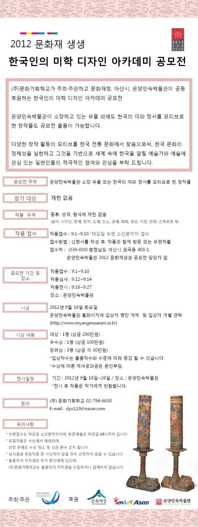문화재청, 아산시, 온양민속박물관이 공동 후원하고 (주)문화기획학교가 주최·주관하는 한국인의 미학 디자인 아카데미 공모전 다양한 창작 활동의 모티브를 한국 전통 문화에서 찾음으로써, 한국 문화의 정체성을 실현하고 그것을 기반으로 세계 속에 한국을 알릴 예술가와 예술에 관심있는 일반인들의 적극적인 참여과 관심을 부탁드립니다. 1. 공모전 기간 및 장소 기간 : 접수 9월 1일 ~ 9월 10일 (참가비 없음) 심사 9월 12일 ~ 9월 14일 시상 9월 18일 전시 9월 18일 ~ 9월 27일 장소 : 온양민속박물관 2. 작품 제출 및 유의 사항 제출 : 2012년 9월 1일 ~ 9월 10일 (방문 또는 우편 접수) 접수처 : 336-030 충청남도 아산시 권곡동 403-1 온양민속박물관 2012 문화재 생생 공모전 담당자 앞 유의사항 : 공모전 신청서는 작품과 함께 제출합니다. 우편접수는 마감일 소인분까지이며, 방문제출은 마감일 18시까지입니다. 3. 작품 주제 및 규격 주제 : 온양민속박물관의 유물 또는 한국의 미를 모티브로 한 자유 창작품 규격 : 종류, 성격, 형식에 제한 없음 (음악, 디자인, 문예창작, 도예, 조소, 공예, 회화, 영상, 사진, 만화, 건축모형 등) 4. 시상 시상식 : 9월 18일 / 온양민속박물관 시상내역 : 대상 1명 200만원 / 우수상 1명 100만원 / 장려상 3명 30만원 (제세공과금은 본인 부담입니다.) 5. 전시 전시 : 9월 18일 ~ 9월 27일 / 온양민속박물관 전시 후 작품은 작가에게 반환 *기타 문의사항은 (주)문화기획학교 Tel 02-794-6630 / Fax 02-794-6635 또는 이메일 dyo119@naver.com으로 문의해 주세요. * 공모전 참가신청서는 첨부된 파일을 확인 해 주시길 바랍니다.