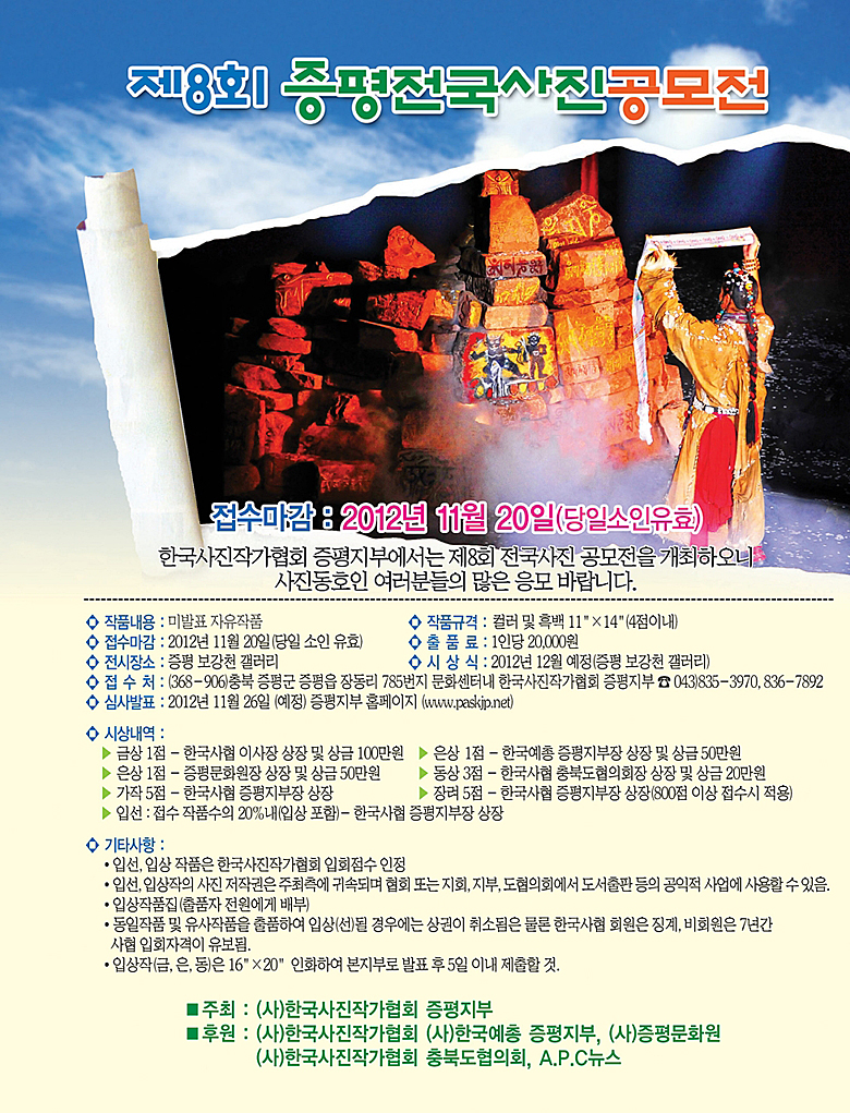 | 접수처 | 충북 증평군 증평읍 장동리 785번지 문화센터내 한국사진작가협회 증평지부 |