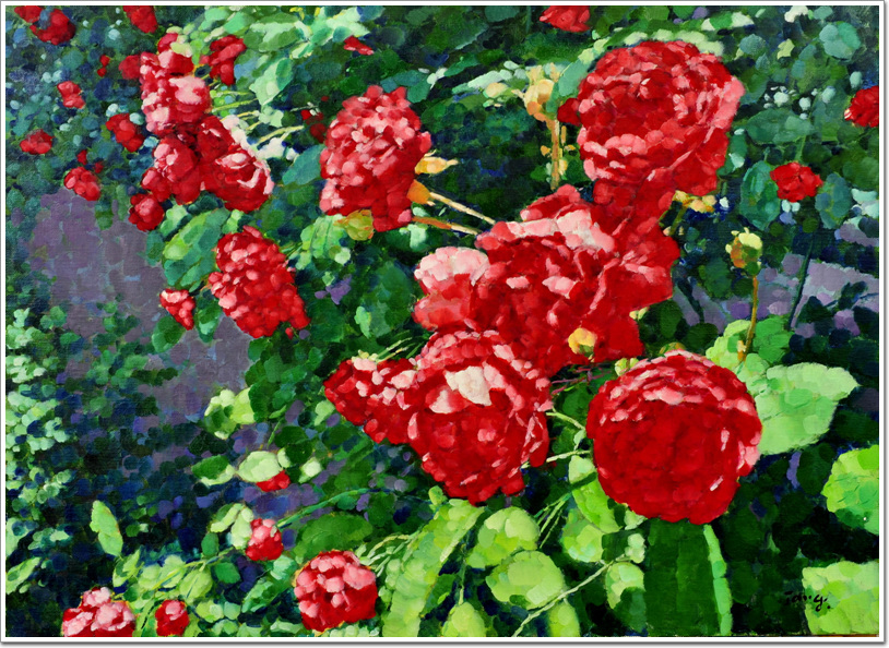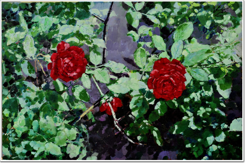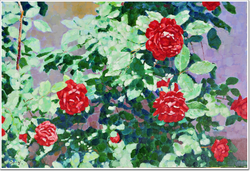 화가 이장우는 여러 종류의 꽃들 중에서도 장미꽃의 자연스런 풍경을 감성적으로 재해석하며 꾸준히 화면에 구사해온 작가이다. 감성이란 완전한 인식을 위한 정신적인 작업에서 본질적으로 느끼게 되는 정서情緖를 뜻하며 그 러한 작가의 감성적 경험이 언어나 개념의 체계보다 더욱 참된 모습으로 내면에 존재해 있는지도 모른다.