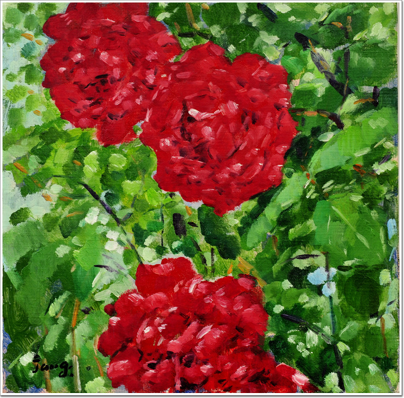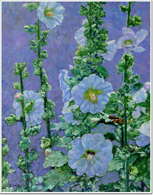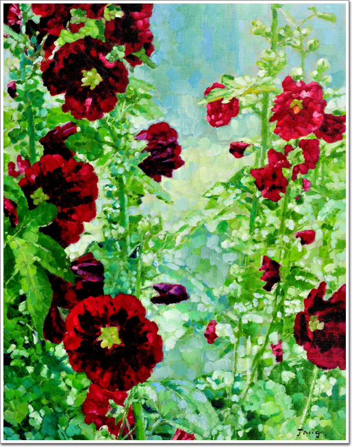 그는 담벼락에 흐드러지게 핀 장미꽃 외에도 접시꽃, 연꽃 등 야생화를 즐겨 선택하고 있다. 아름다운 자연 그대로의 꽃들을 화면에 담아 재구성하는 과정에서 나타난 공간감은 주관에 의해 자율적으로 이루어진 공간이며 이는 곧 직관력에 따른 감성 표현의 결과물이라고도 할 수 있다.*