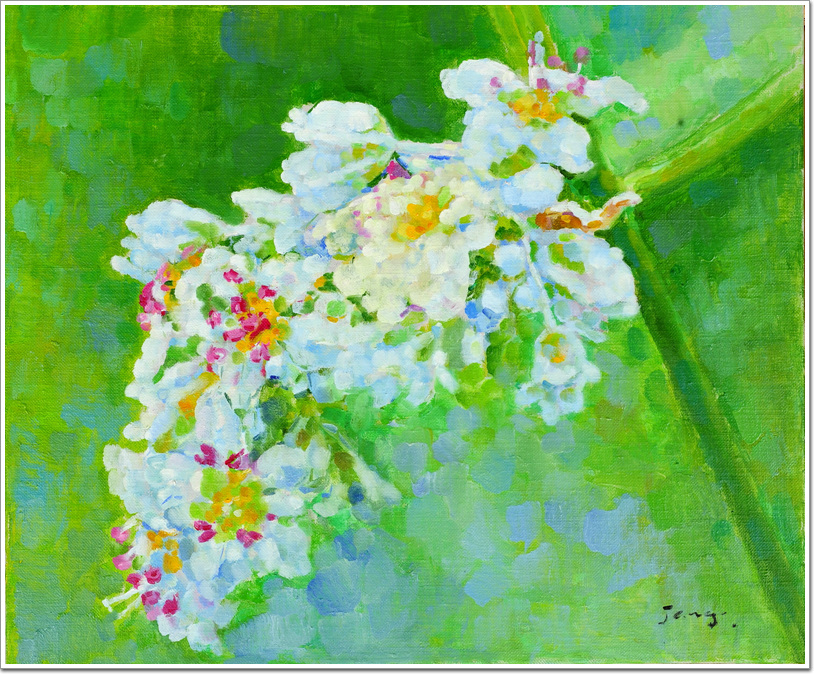 때문에 그의 작품에서 중요한 비중을 차지하고 있는 색채의 요소들은 자연에 대한 미적 관조觀照와 섬세한 감수성을 기본바탕으로 하고 있으며 밝고 맑은 색상을 선택하여 전체 화면의 꽃을 다양한 색채와 더불어 생동감 넘치는 현실 속의 또 다른 꽃을 볼 수 있도록 했다.