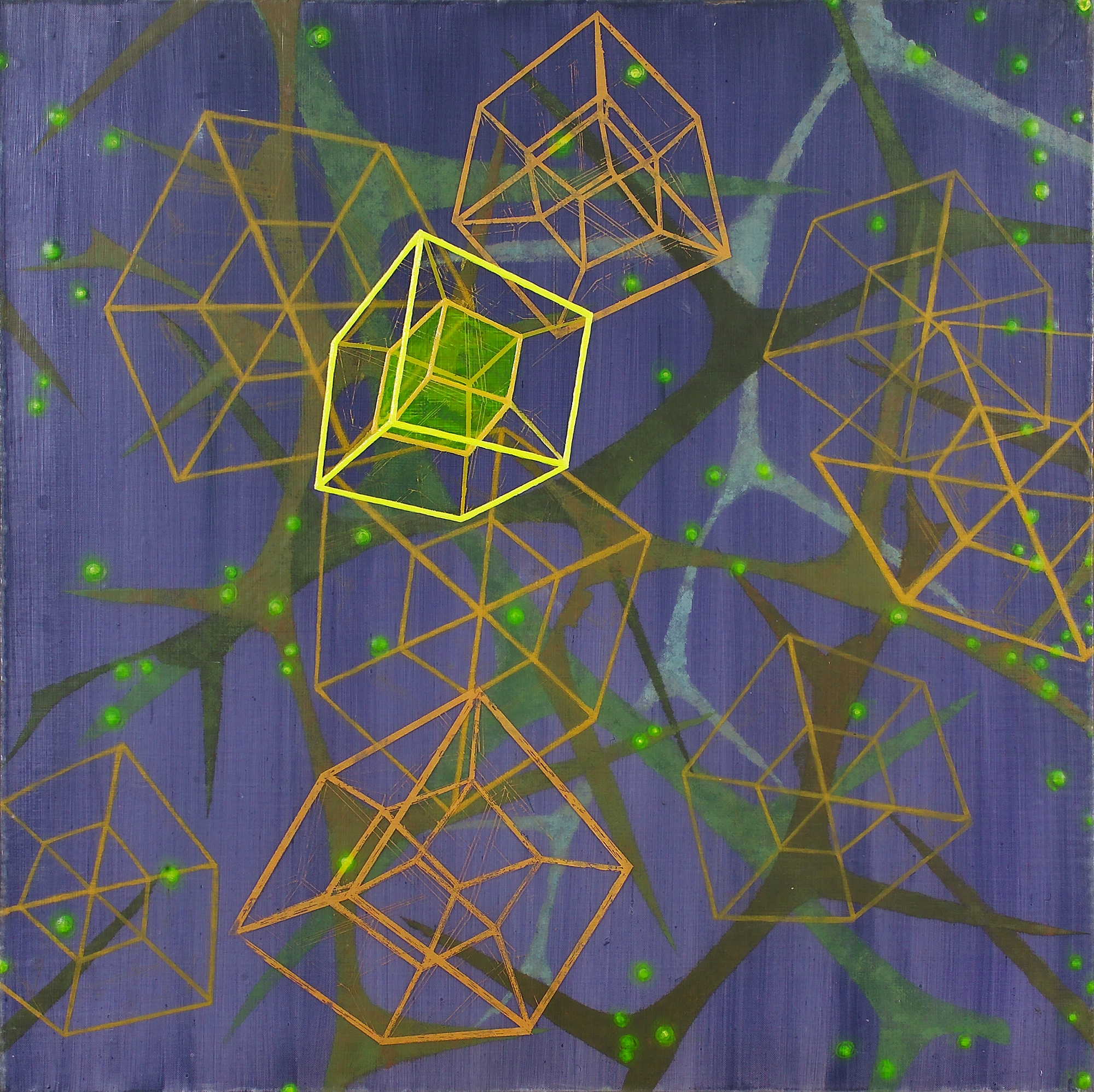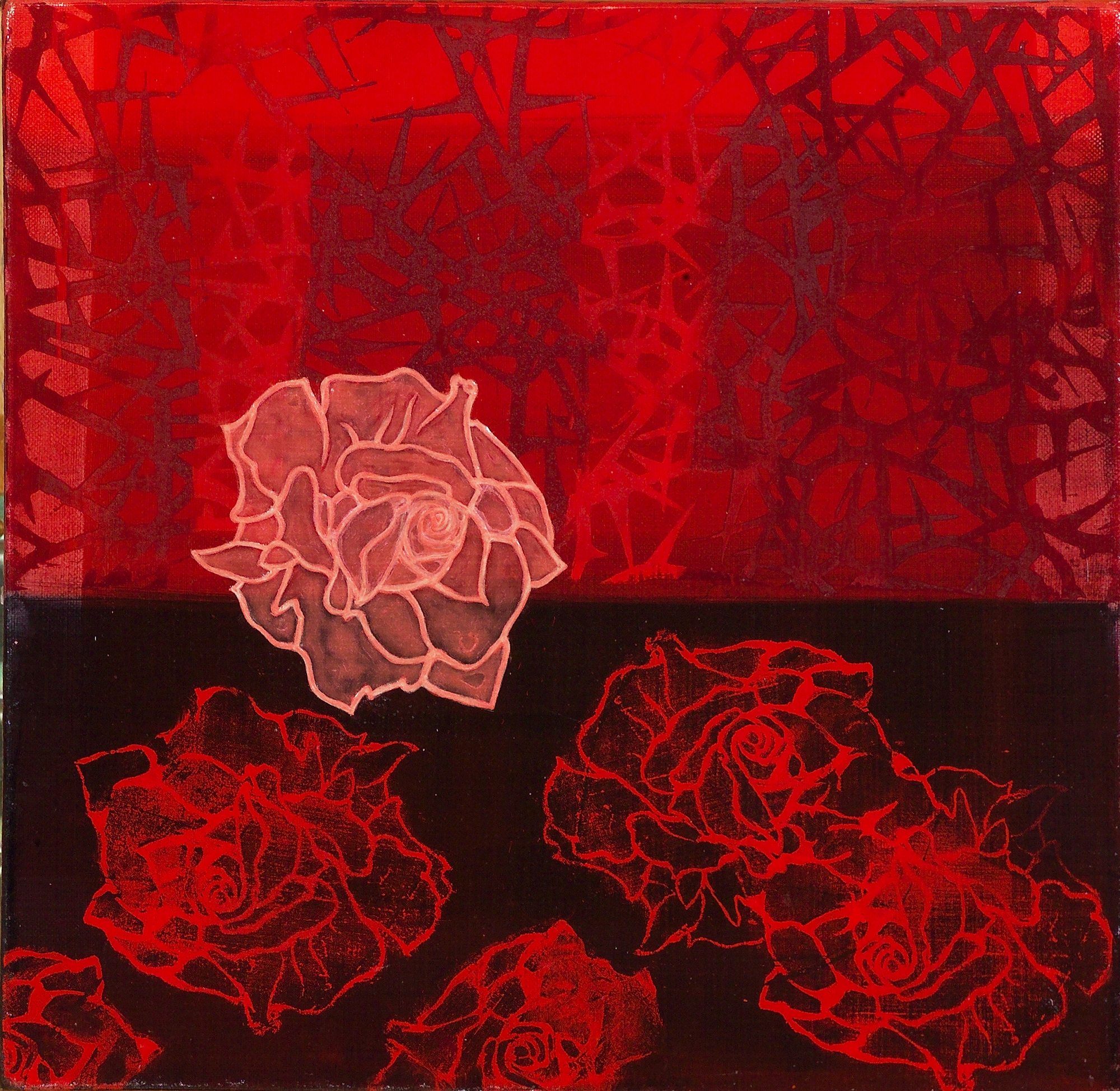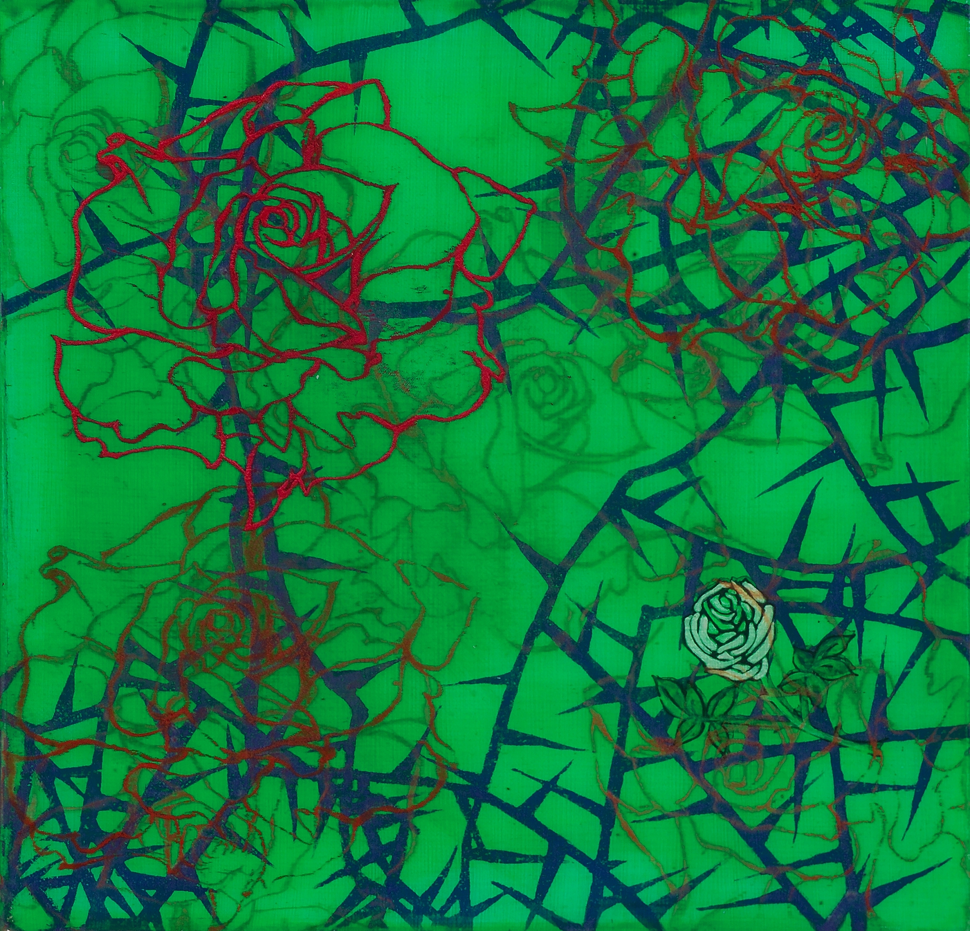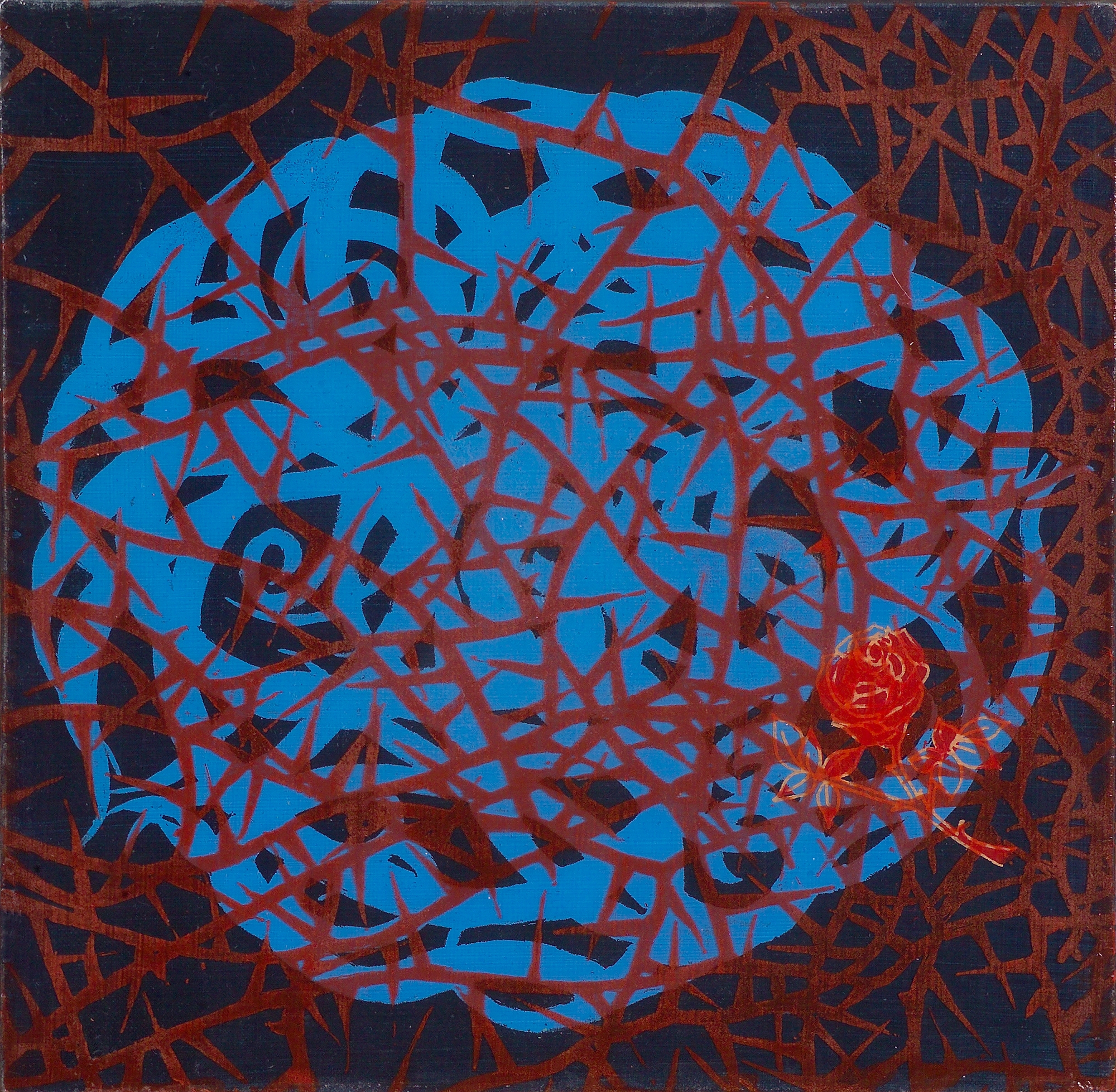 인간의 생각을 시발점으로 한 나의 작업의 모티브는 인간의 머리카락이다. 인간의 복잡미묘한 생각을 화면에 불어 넣어 숨쉬게할 수 있는 유일한 방법은 머리카락의 자유분방한 뒤얽힘이다. 그 머리카락은 자연과 결부되어 줄기와 가시로 변화한다.